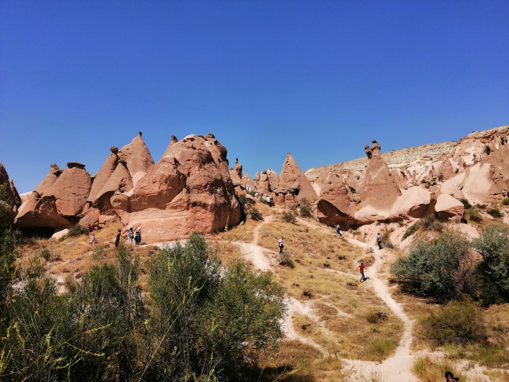 Trag na ovom mestu je ostavila i ljudska ruka, tako što su drevni stanovnici Kapadokije primitivnim oruđem klesali stene u kojima su stvarali svoje domove, crkve, manastire i skloništa, ali danas na ovim mestima postoje i ugostiteljski objekti.